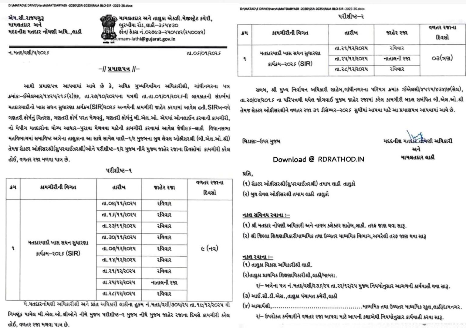 આમુખ-૧. અધિક મુખ્ય નિર્વાચન અધિકારીશ્રી મુખ્ય નિર્વાચન અધિકારીશ્રીની કચેરી ગુ.રા.... ગાંધીનગરના તા.૨૭/૧૦/૨૦૨૫ના પત્ર ક્રમાંક : ઈએલઆર/૧૪૨૫/૨૧૬(૨)/છ. આમુખ-૧ ના પત્ર સાથે સામેલ ભારતના ચૂંટણી પંચ, નવી દિલ્હીના તા.૨૭/૧૦/૨૦૨૫ ના પત્રથી તા.૦૧.૦૧.૨૦૨૬ ની લાયકાતની તારીખના સંદર્ભમાં મતદારયાદીનો ખાસ સઘન સુધારણા કાર્યક્રમ જાહેર કરવામાં આવેલ છે. ભારતીય ચૂંટણી પંચ દ્વારા તા.૨૭/૧૦/૨૦૨૫ નાં રોજ ગુજરાત રાજય સહીત કુલ ૧૨ (રાજ્યો અને કેન્દ્રશાષિત પ્રદેશ) માં સ્પેશીયલ ઇન્ટેન્સીવ રીવિઝન (SIR) લાગુ કરવામાં આવ્યું છે. જે અન્વયે સ્પેશિયલ ઇન્ટેન્સીવ રીવિઝન (SIR) માં કુલ છ તબક્કામાં કામગીરી કરવામાં આવશે જેમાં પ્રથમ તબક્કામાં છાપકામ અને તાલીમ કામગીરી તા.૨૮/૧૦/૨૦૨૫ થી ૩/૧૧/૨૦૨૫ બીજા તબક્કામાં ઘરેથી ઘરે મતદાર ગણતરી ફોર્મ વિતરણ તેમજ મતદાર પાસેથી ગણતરી ફોર્મ એકત્રિત કરવાની કામગીરી તા.૦૪/૧૧/૨૦૨૫ થી ૦૪/૧૨/૨૦૨૫. ત્રીજા તબક્કામાં DRAFT ELECTORAL ROLLS ની પ્રસિધ્ધી કામગીરી તા. ૦૯/૧૨/૨૦૨૫ અને ચોથા તબક્કામાં વાંધા અને સુચનોની કામગીરી તા.૦૯/૧૨/૨૦૨૫ થી ૦૮/૦૧/૨૦૨૬ તેમજ પાંચમાં તબક્કામાં નોટિસ (સાંભળણી અને ચકાસણી) કામગીરી તા.૦૯/૧૨/૨૦૨૫ થી ૩૧/૧/૨૦૨૬, છઠ્ઠા તબક્કામાં આખરી મતદાર યાદીની જાહેરાતની કામગીરી તા.૦૭/૦૨/૨૦૨૬ નાં રોજ કરવામાં આવશે.
